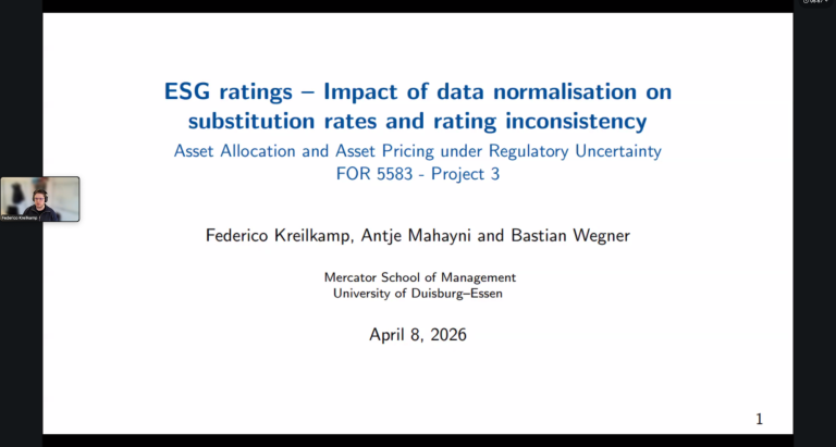 On April 8, 2026, we continued our monthly online seminar series "Asset Allocation and Asset Pricing under Regulatory Uncertainty" with an engaging session on ESG ratings and current project developments. Two presentations offered both methodological depth and a forward-looking perspective.